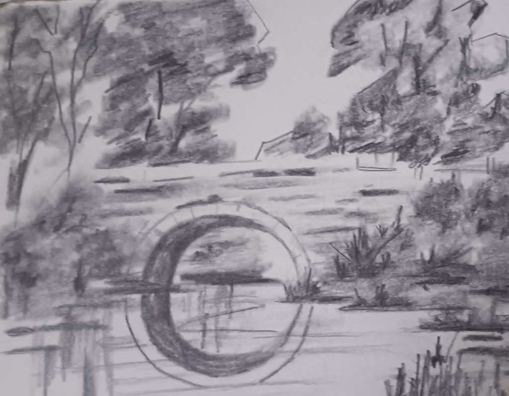 This is a pencil drawing of a bridge I saw when in Virginia. Of course, I added some details, like foliage rather than our present stark winter landscape. I’m ready for spring!
