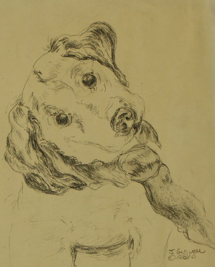 Right: Scratchboard drawing of a dog. His name was “Harry” Scratch board is an unusual technique where a treated board is coated with ink and the picture is scratched out. It’s like working in reverse as the color is there and the detail is removed for the end result of a pleasing drawing.