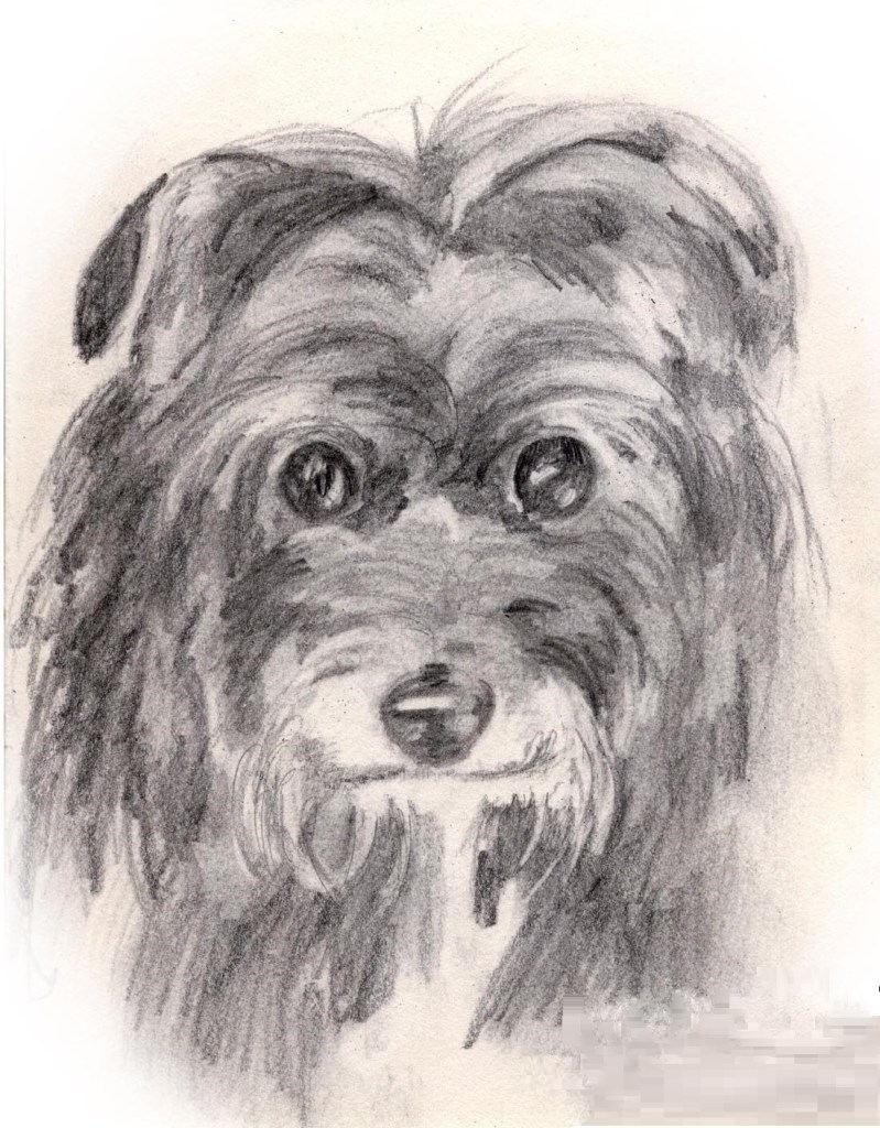 This is a pencil drawing of my first dog, a Tibetan Terrier mix named, “Harry.”